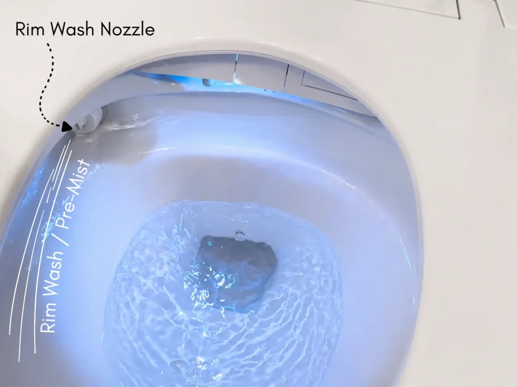 Before each flush cycle, the toilet automatically releases a micro-foam layer into the bowl. This foam creates a physical barrier that reduces splashing, minimizes waste adhesion to ceramic surfaces, and acts as an odour barrier. The foam dispenser has a dedicated refill compartment with a replaceable bottle. A cleaner bowl with less scrubbing — it sounds like marketing, but it works as described.